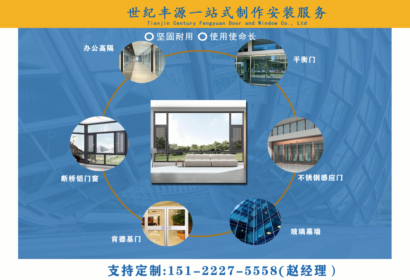 天津世紀豐源門窗有限公司從事斷橋鋁門窗,玻璃幕墻,平衡門,肯德基門,不銹鋼感應門,百葉窗,辦公高隔,制作安裝一站式訂制生產及配套服務等?! 」咀猿闪⒁詠?,始終堅持以人才為本、誠信立業的經營原則,薈萃業界精英,成熟的技術、管理方法及企業經驗與國內企業的具體實際相結合,為企業供給各個方面的解決方案,使企業在激烈的市場競爭中始終堅持競爭力,實現企業快速、穩定地發展?! ≠|量好、服務好、才能信譽好,公司已在諸多領域取得輝煌成績,愿意成為您可信賴的長期合作伙伴。 讓我們攜手同行,共同實現“讓普通老百姓都用得上高端門窗”...